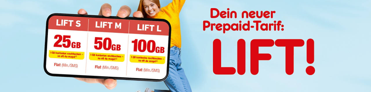 Mit LIFT M bekommst du den idealen Allround-Tarif: viel Datenvolumen, starke Leistung und volle Flexibilität – plus der einzigartigen Möglichkeit, jederzeit kostenlos Daten nachzubuchen.